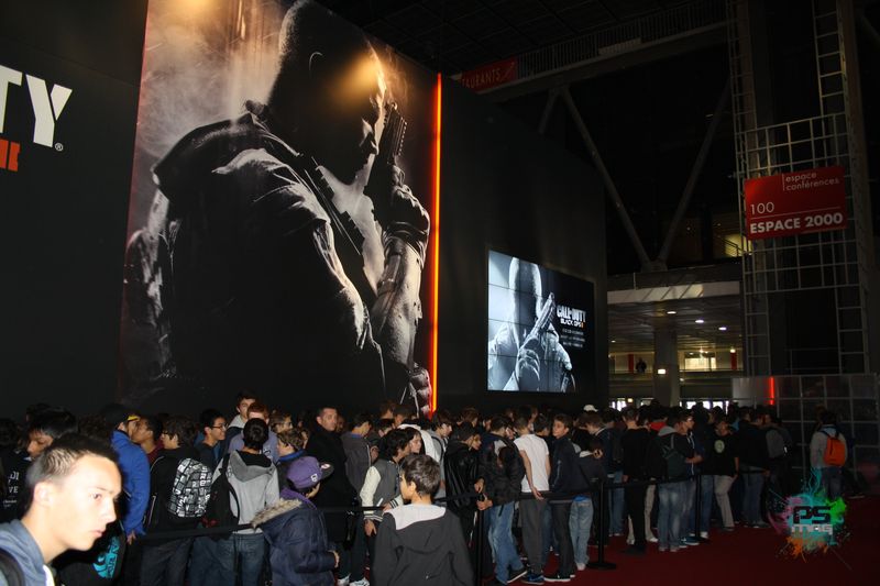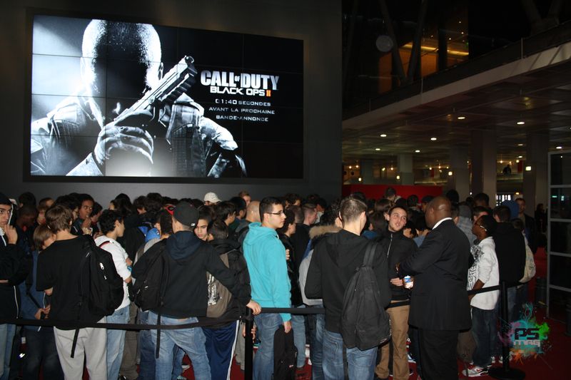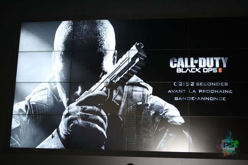 Une fois la porte passée, sur laquelle est mentionné que les apprareils photos ne sont pas les bienvenus, vous entrez dans la salle de chauffe…au sens propre comme au figuré. La session comptait une cinquantaine de personnes agglutinées dans une salle étroite. La température monte et l’hôtesse nous invite à nous munir de casque à disposition sur des bornes. Avant de pouvoir accéder à la salle de jeu, l’éditeur propose deux vidéos pour nous présenter quelques évolutions du jeu. Une première avec les commentaires du studio Treyarch sur l’environnement sonore qui se veut très immersif dans ce nouveau volet. Ok, on prend. La seconde aborde plus particulièrement le multi, avec les nouveautés introduites pour la création des classes, les différents perks, le système de killstreaks basé dorénavant sur le scoring et les modes de jeu. Avant de faire un malaise, les portes de la salle suivante s’ouvre pour enfin commencer la démonstration.