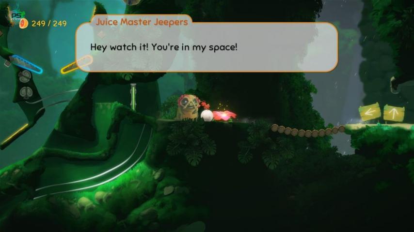 Le gameplay est en plus d'une simplicité désarmante : L2 pour les bumpers bleus, R2 pour les orangés, l'un ou l'autre pour ceux qui ont les deux couleurs, et c'est parti ! La plupart du temps, il vous faudra dévoiler et casser des petits cristaux violets pour ouvrir la porte vers la suite, mais ce sera parfois un peu retors et vous aurez alors besoin de tout ce que le jeu peut mettre à votre disposition (à commencer par les limaces explosives). Et c'est tout ce que vous avez besoin de savoir pour vraiment vous lancer dans la grande aventure de Yoku qui, de simple facteur, va devoir neutraliser le Déicide qui attaque les divinités de l'île. Il faut voir grand, dans la vie, même quand on est un bousier.