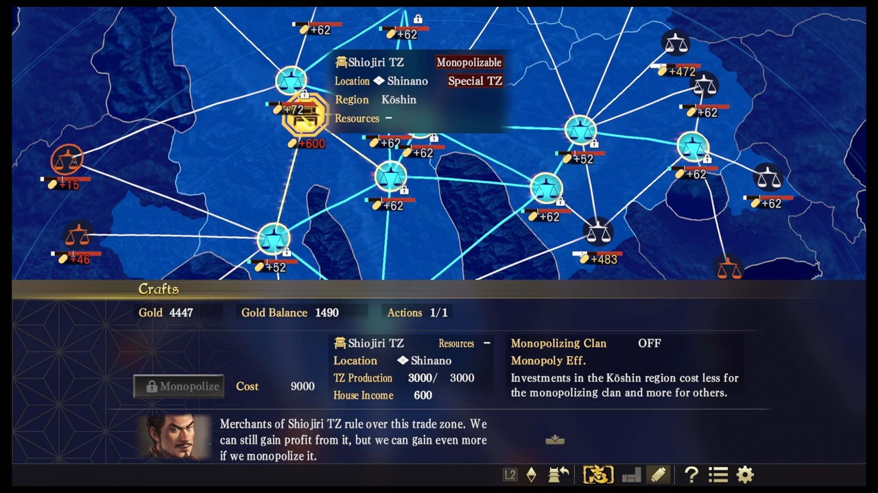 Au niveau de ce que vous aurez à faire, on retrouve toutes les bases de Sphere of Influence, mais aussi et surtout une différence majeure : l'accent est mis ici sur le commerce. En effet, Sphere of Influence vous proposait de renforcer et fortifier les routes, de mener des alliances militaires, et principalement de conquérir et unifier le Japon. Ici, rien qui concerne les routes, il s'agira de bâtir et renforcer des zones commerciales pour augmenter les sources de revenus, par les accords ou la conquête. Dans cette optique, il faudra encore plus veiller à l'équilibre financier qu'avant en matière de recrutement militaire.