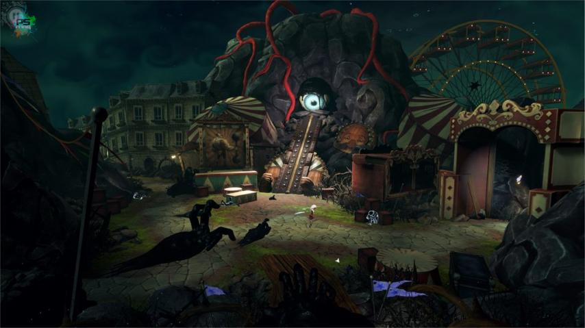 Illusion est un jeu assez sombre. Par son sujet (que j’essaie au mieux de ne pas vous spoiler), son histoire, et ses décors. Ici, on voyage dans un esprit torturé, dans lequel les décors sont parfois submergés par une sorte de liquide noir qui ne nous veut pas du bien. Au cours des trois chapitres du jeu, cirque fantôme, grottes ombres, ou encore champs de bataille, tous sont soumis à ces ténèbres. La direction artistique est d’ailleurs très bonne, égale sur toute la longueur du jeu et même si on est loin d’une production triple A, le jeu est beau.
