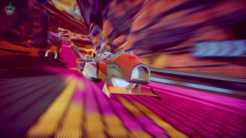Dès le lancement du jeu, on est surpris par les couleurs vives, chaudes et chatoyantes accompagnées par une bande son énergique et le démarrage de la campagne nous introduit à des personnages dignes des comics et dessins animés typés 80’s. On se retrouve sur la première piste et là, même constat en jeu. C’est très lumineux, vif, et l’enrobage en cell shedding accentue encore plus l’ambiance très légère. Car même s’il s’agit d’un jeu de courses, on est plus près d’une ambiance fun à la ModNation, très arcade, plutôt que de la simulation ou d’un titre plus sérieux à la WipeOut ou encore F-Zero.