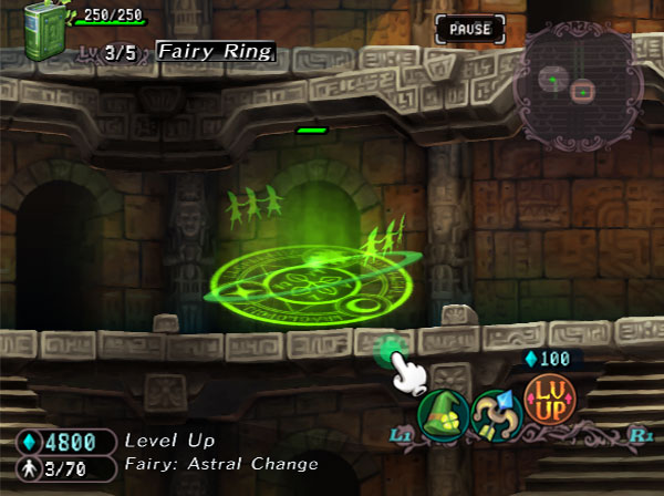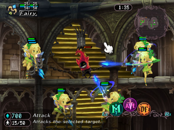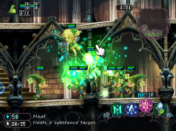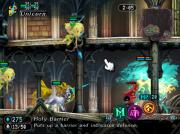 Vous faites face à un tableau en coupe transversale 2D reprenant en toile de fond les couloirs et escaliers de l’école de magie. Vous devrez à chaque fois affronter les forces des ténèbres hantant le niveau. Pour cela à votre disposition, vos sorts d’invocation répartis en quatre familles : Glamour, Sorcellerie, Nécromancie et Alchimie. Chacune de ces familles a bien sûr ses spécificités en termes de sorts et de créatures invocables. Pour y faire justement appel, sont habilement parsemés dans le niveau des cristaux de Mana que vous devez activer. Le Mana, c’est le nerf de la guerre. Une fois suffisamment de ressources accumulées, vous pouvez invoquées les créatures (appelées familiers) associées aux glyphes des quatre familles correspondantes. Par exemple, le glyphe Glamour vous donnera accès aux elfes, fées armées d’arc et licornes. Tandis que la Nécromancie proposera des esprits ou des fantômes guerriers pour vous venir en aide. En vrac, on pourra aussi citer des lutins, des grimalkins, des chimères, des homoncules et des golems. Soit un bestiaire très complet à portée de baguette magique.