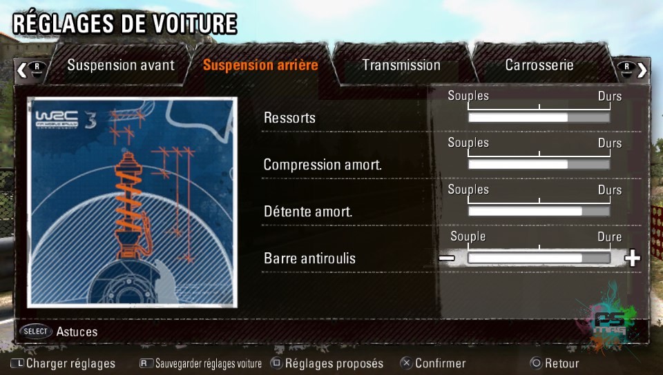 On peut également personnaliser complètement les réglages de la voiture pour éviter d'avoir trop souvent à réparer le véhicule entre les spéciales, cela peut-être un handicap pour la suite d'un championnat si vous avez subi trop de dégâts. Pour éviter tout accident, il existe un moyen de retourner dans le temps (flashback) et ainsi réparer l'erreur d'un freinage trop brutale qui finit par un tonneau. Cette option est fort plaisante et permet d'avoir une assurance tout risque.