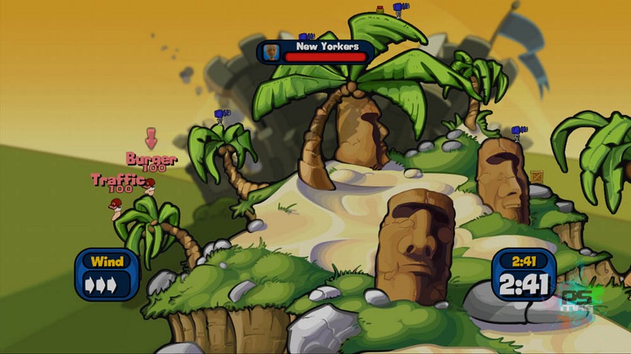Pour finir avec le mode "Partie locale" on apprécie surtout le mode "Versus" qui est l'essence même du Worms de latter la figure de nos potes avec un bon paquet de chips bien salées. On retrouve pour le multi local, 5 modes de jeux avec des règles bien distinctes tel que le classique Match à mort, le magnifique Homeland qui nous permet de contrôler son propre fort, le ténébreux mode Destruction qui vous oblige à détruire le plus rapidement possible la base de votre ennemi, suivi par la "Défense de statue" et la "règle du Survivant" qui sont toutes deux aussi amusantes à jouer.